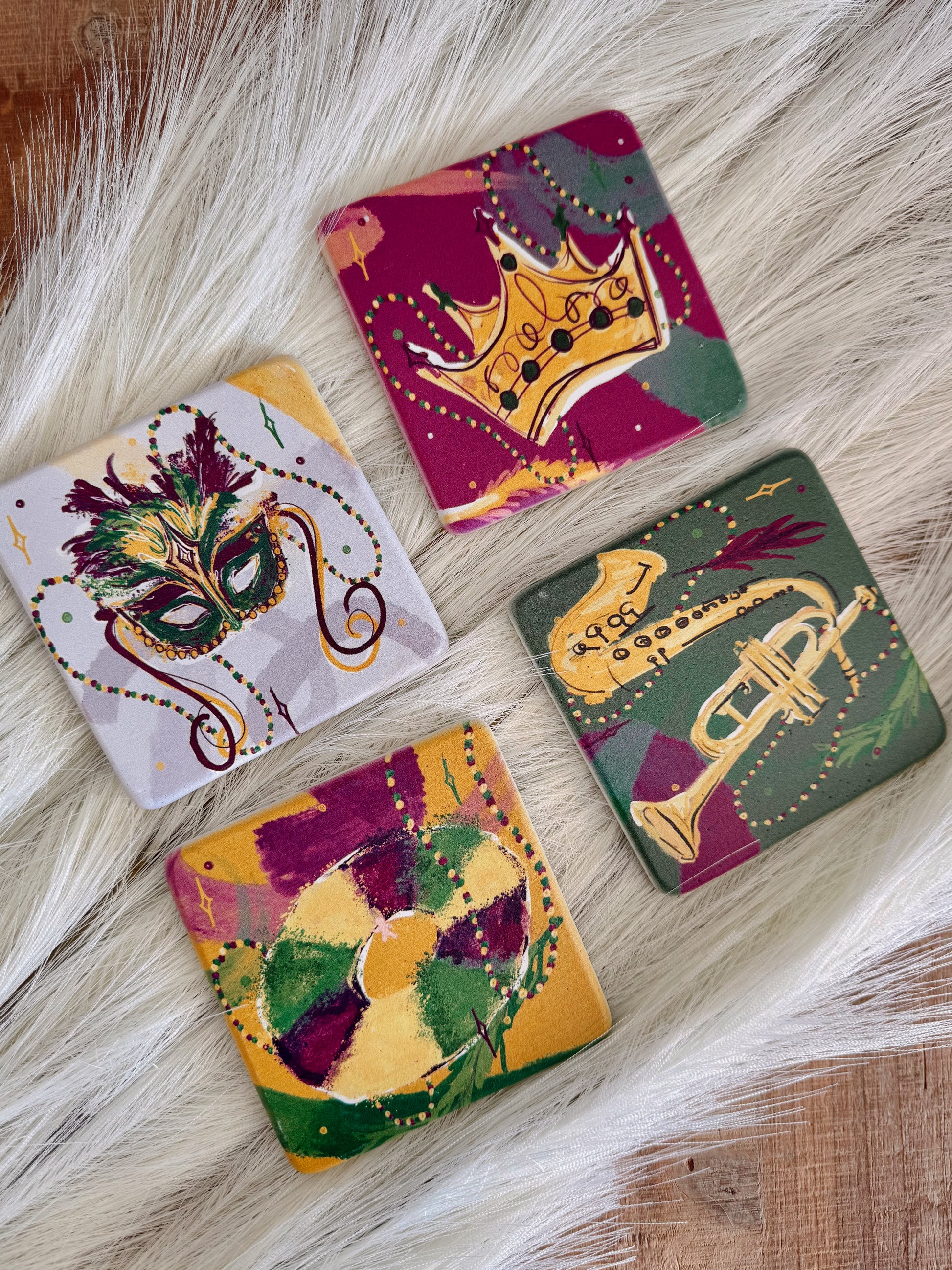 This set of 4 ceramic coasters features festive Mardi Gras designs including a crown, musical instruments, a mask, and a King Cake—each accented with colorful Mardi Gras beads. It’s a fun and vibrant way to bring the spirit of Mardi Gras into your home while protecting your surfaces.