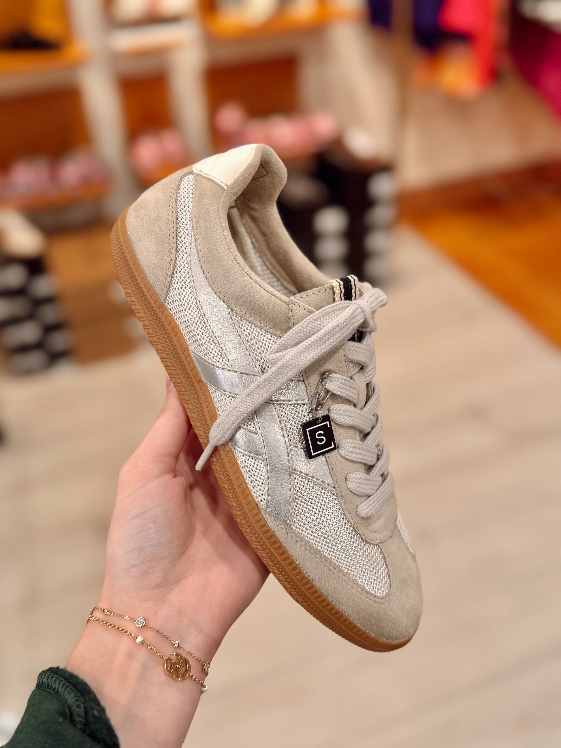 Elevate your style with this chic sneaker, crafted from suede and breathable mesh for a sophisticated yet casual look. The metallic silver faux leather stripes add a sleek, modern touch, making it a versatile choice for any wardrobe. The durable gum rubber sole provides excellent grip and comfort, perfect for all-day wear. Featuring light gray laces and a signature "S" metallic tag, this sneaker combines luxury materials with contemporary design. Step out in style and make a statement with every step.