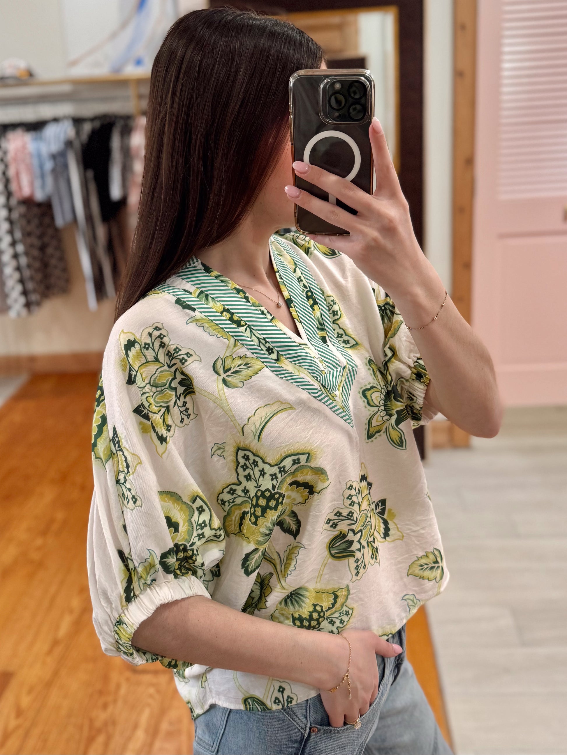 Featuring a soft ivory base with vibrant green floral print and contrast green-and-white striped trim along the collar and neckline, this top is anything but basic.