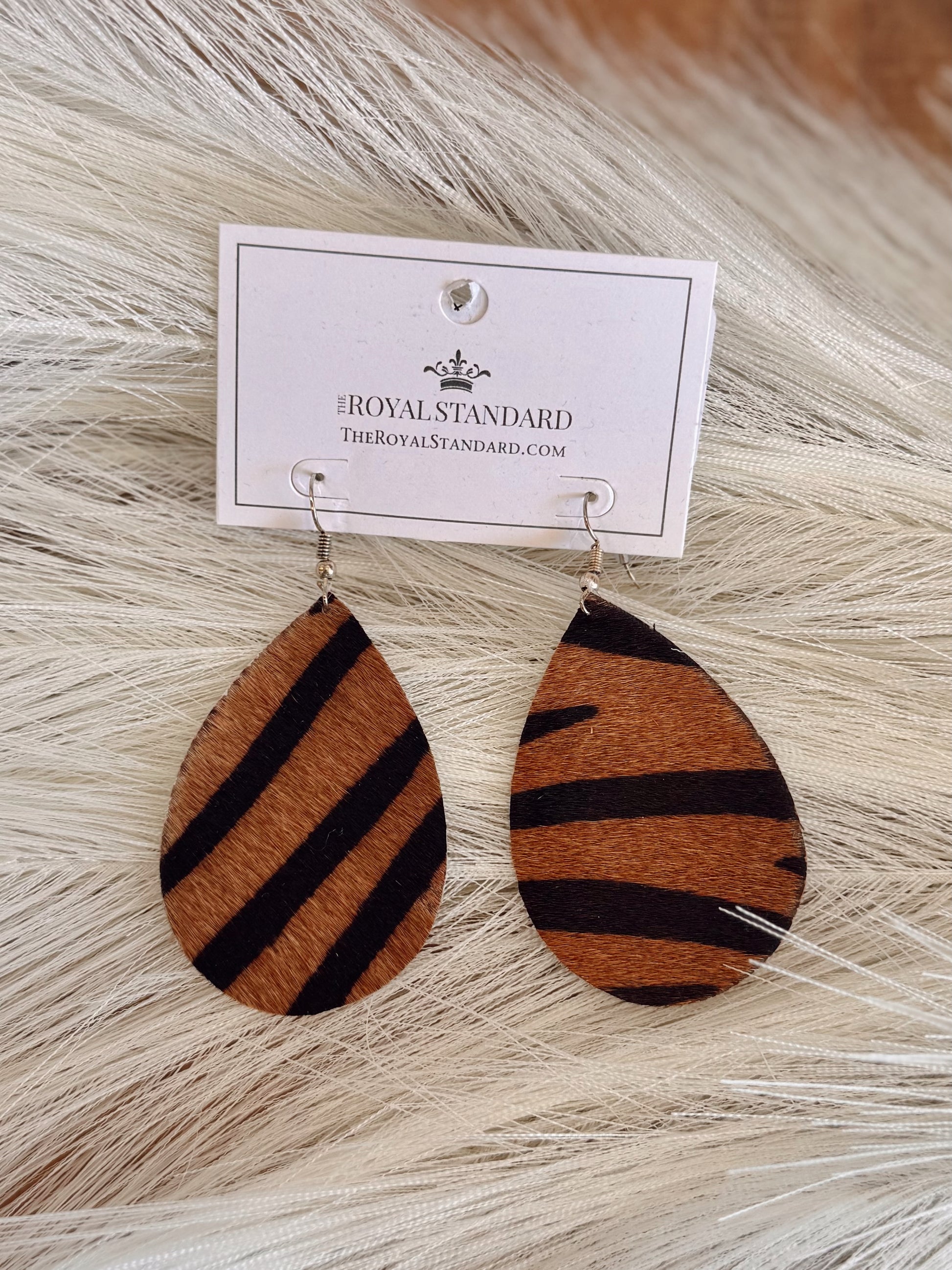 Add a fierce touch of Geaux Tigers energy to your look with our Tiger Gleaux Earrings. These teardrop-shaped beauties feature a bold tiger-stripe pattern on genuine hair-on hide, blending wild style with game-day glam. Lightweight yet eye-catching, they’re perfect for LSU games, fall outfits, or any day you’re feeling a little extra fierce.